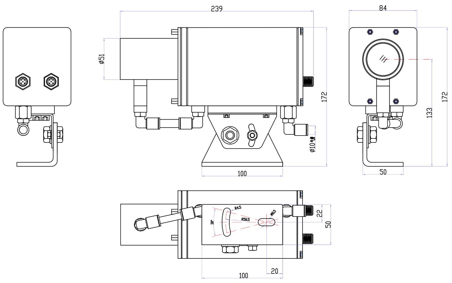 ● 双层合金铝外壳,标准快插接口,可通压缩空气冷却和光路吹扫