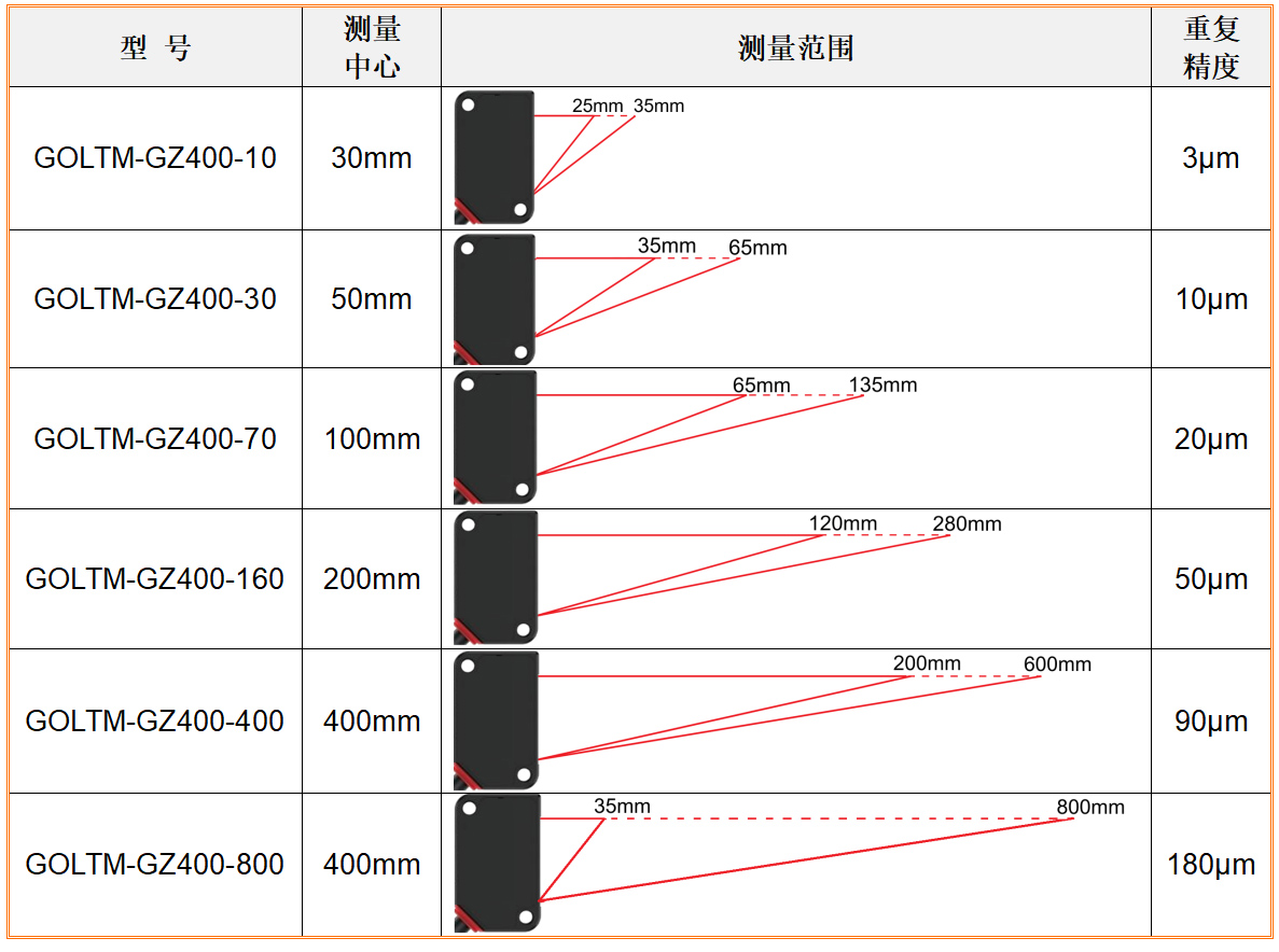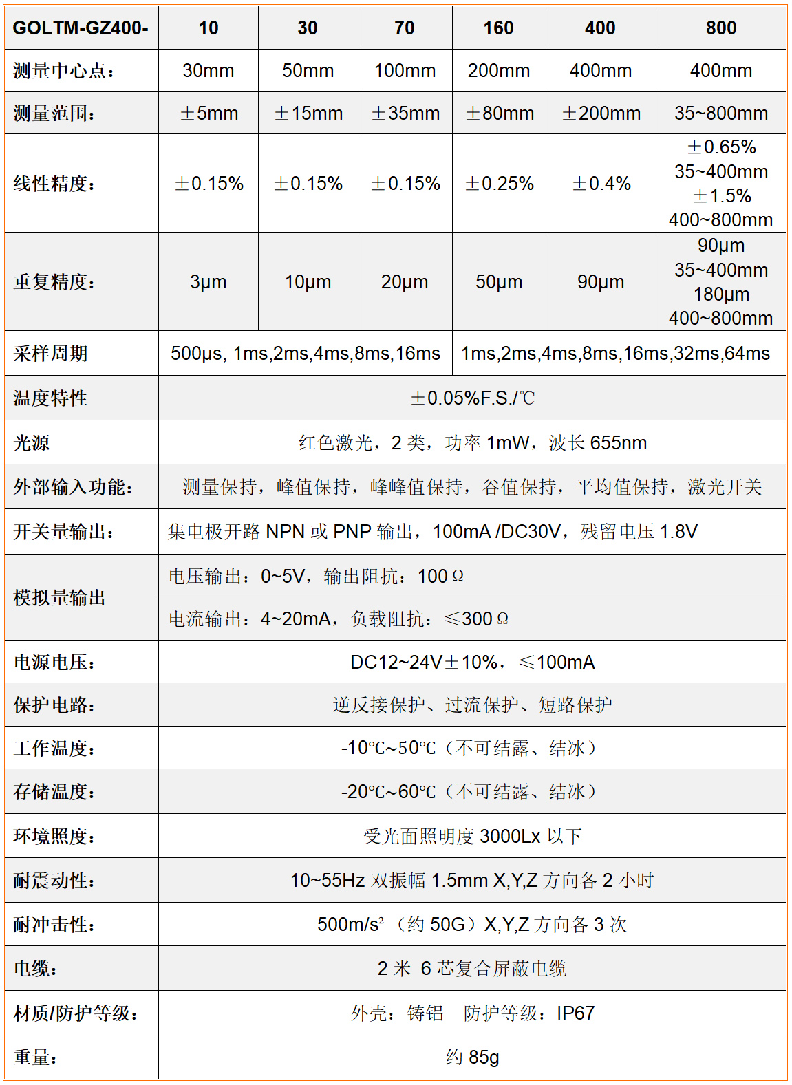 GOLTM-GZ400系列精密激光测距仪可用于高精度、高速度的测量物体位移、尺寸、高度及高度差,安装调试简单,数码显示正负测量值和模拟量输出及开关量输出。